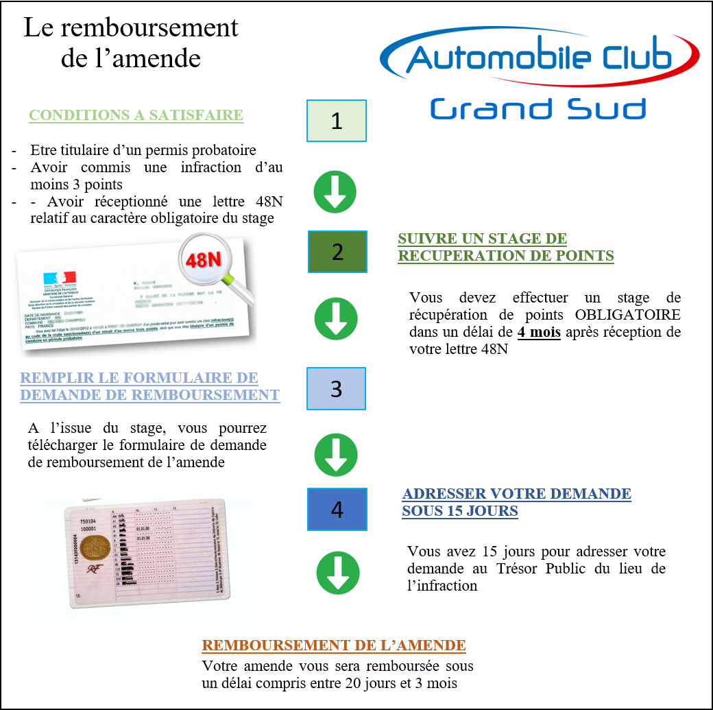 Le stage permet de récupérer jusqu’à 4 points (dans la limite du capital points maximum fixé selon l’année de la période probatoire) et de vous faire rembourser le montant de l’amende.