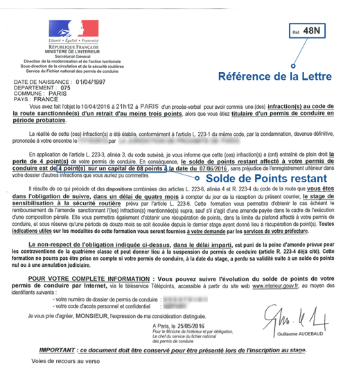 permis probatoire. Ce courrier recommandé est envoyé par le Ministère de l’Intérieur aux conducteurs en période probatoire, qui à la suite d’une verbalisation pour infraction ont été sanctionnés par la perte de 3 points ou plus (exemple : stop, feu rouge, téléphone au volant, ceinture de sécurité, sens interdit…).