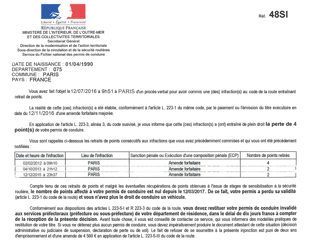 lettre recommandée avec accusé de réception (lettre 48SI) est envoyée par le ministère de l’Intérieur mettant en demeure, le conducteur, de restituer son permis de conduire dans un délai de dix jours.